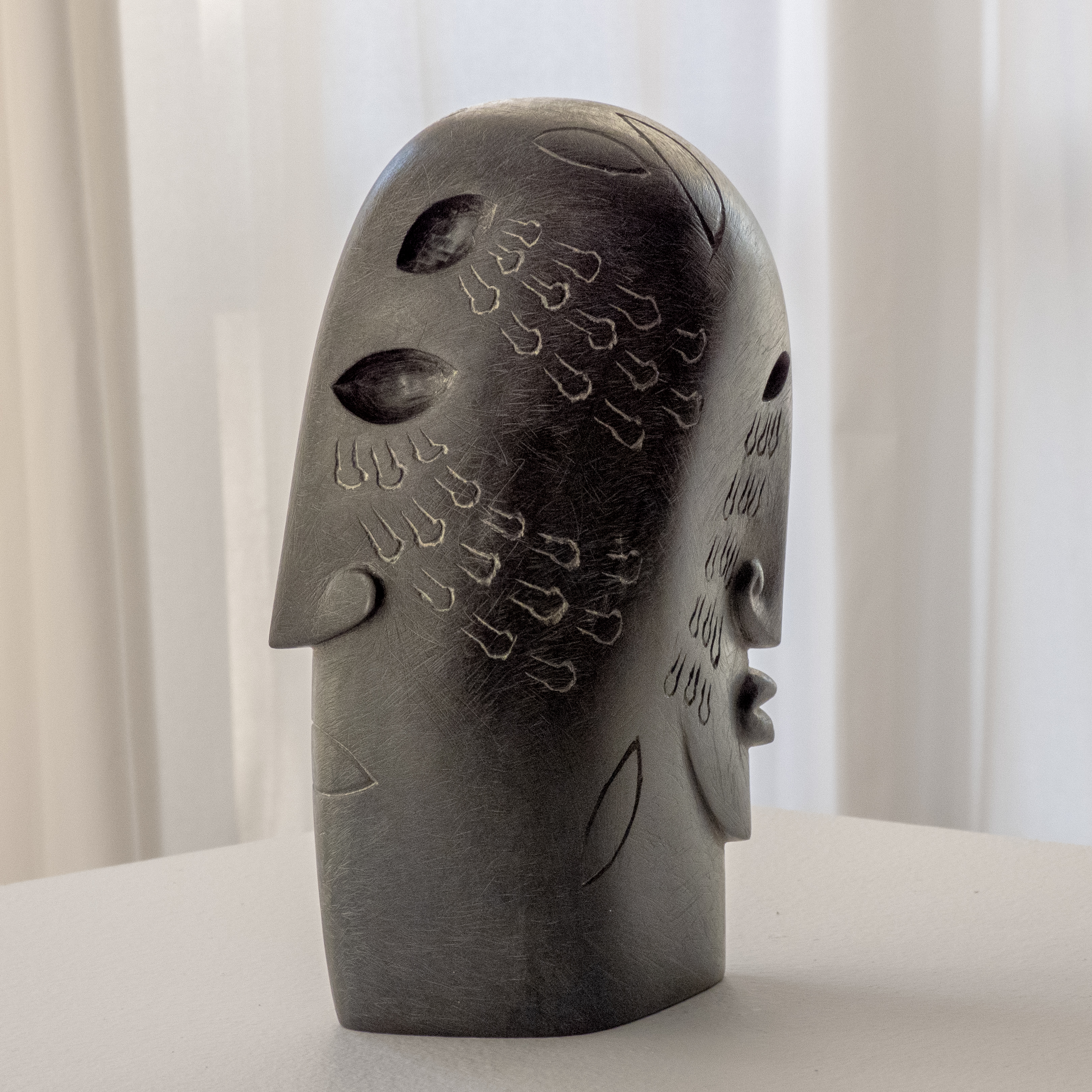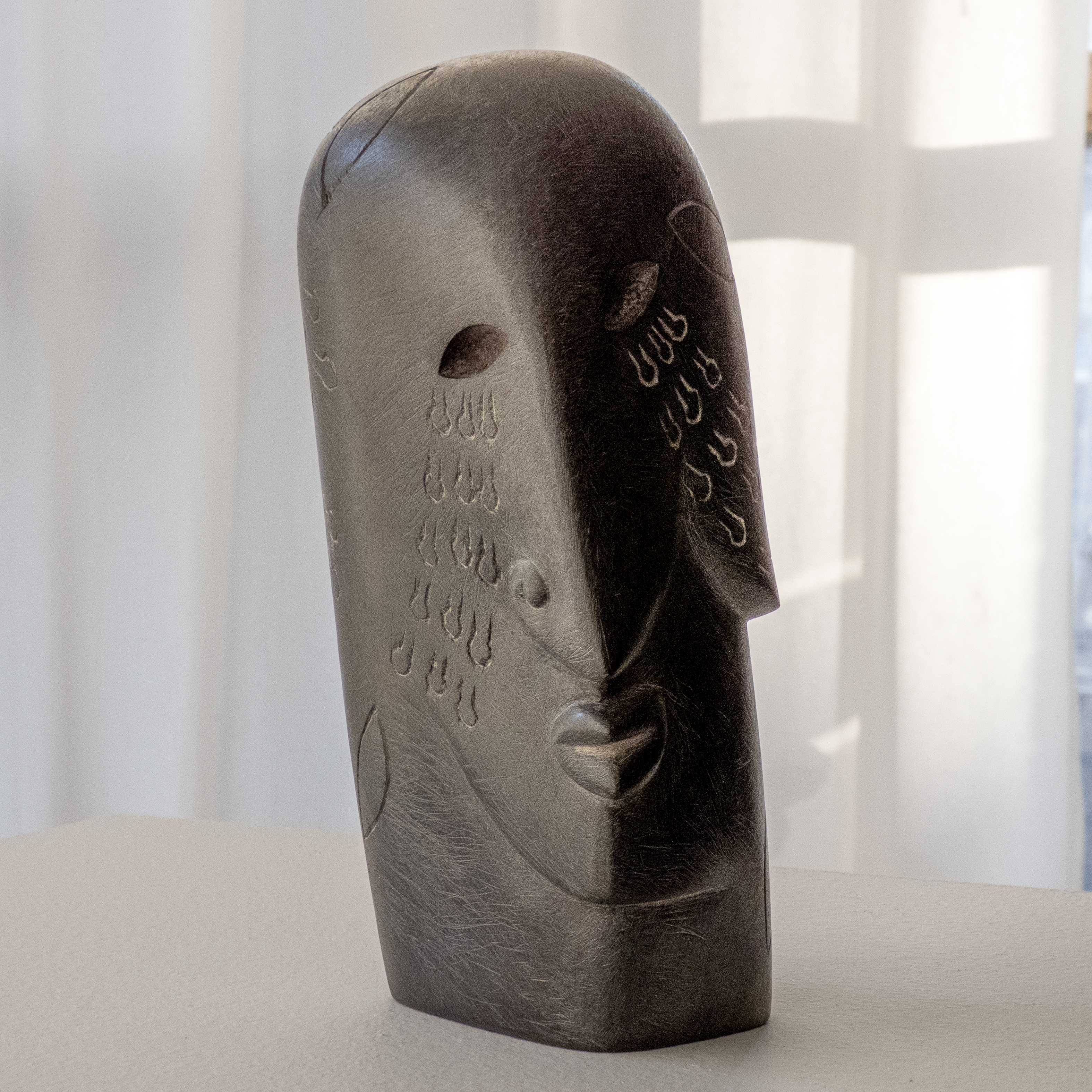 Carved from Kenyan black soapstone, this stylized head merges multiple profiles into a single form that recalls both ancestral masks and the abstract geometry of the lingam. Incised droplet motifs suggest tears, seeds, or seminal traces, evoking Eros as a figure of desire, grief, and renewal.