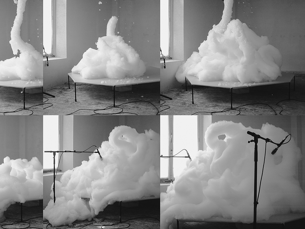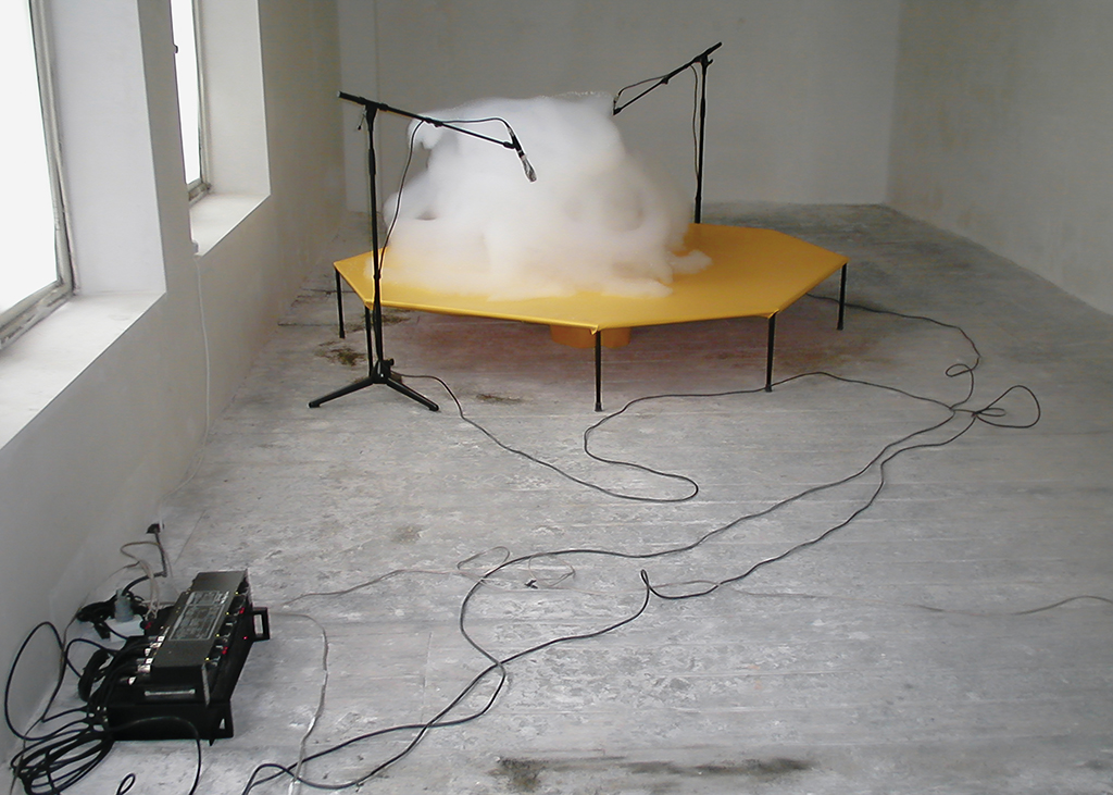 gong Gong (2003) audio live-plastic installation (foam machine, timer, sound system). Exhibited in Gong (Solo Exhibition) Galerie Paolo Boselli, Bruxelles (2003)