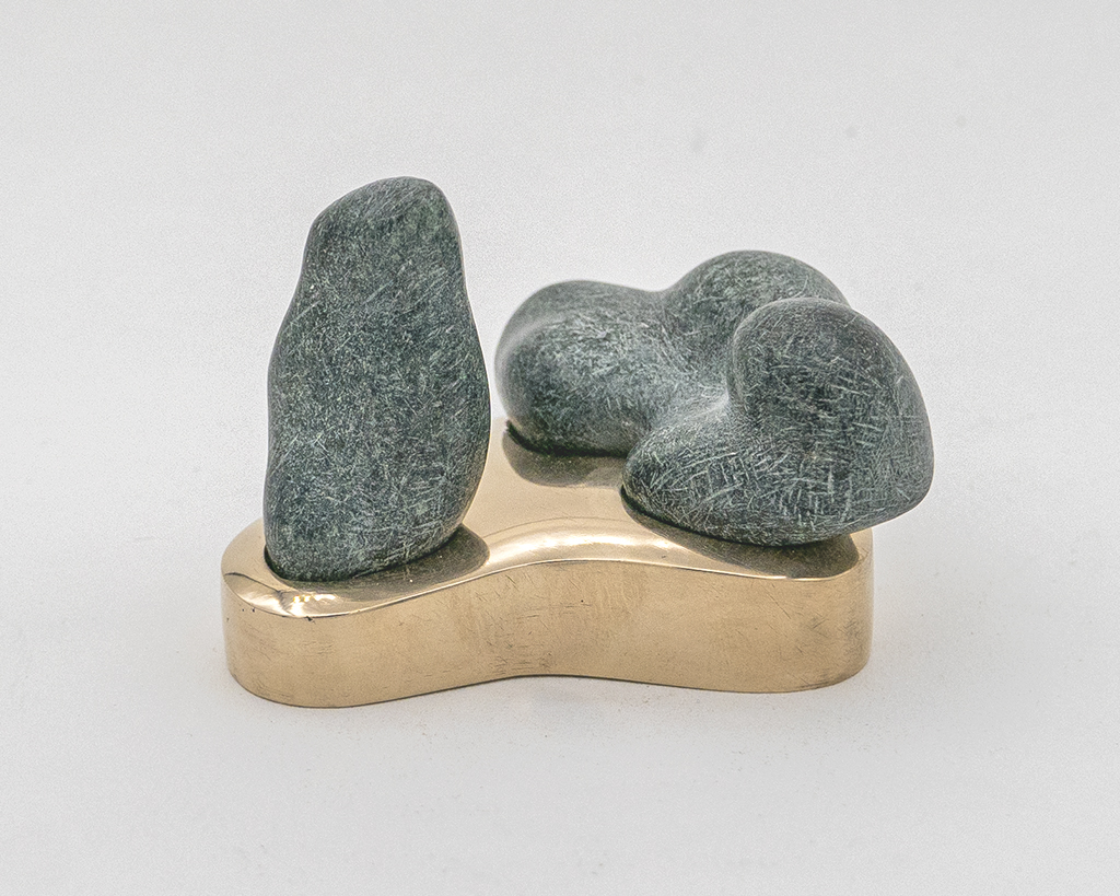 scultura che si tocca con gli occhi scultura che si tocca con gli occhi (2019) indian black soapstone (two forms: L. 5.8 and L. 4.5 cm) and polished bronze: L. 6.9 cm. (photographed at tina’s, bloomfield, pittsburgh)