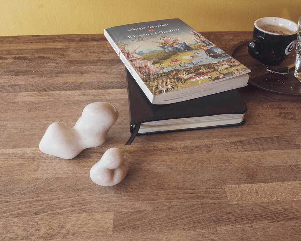 scultura che si separa scultura che si separa (2019) Indian pink soapstone (two forms L. 8.8 cm and L. 4.1 cm) and patinated bronze: L. 9.4 cm (photographed at commonplace coffee, squirrel hill, pittsburgh)
