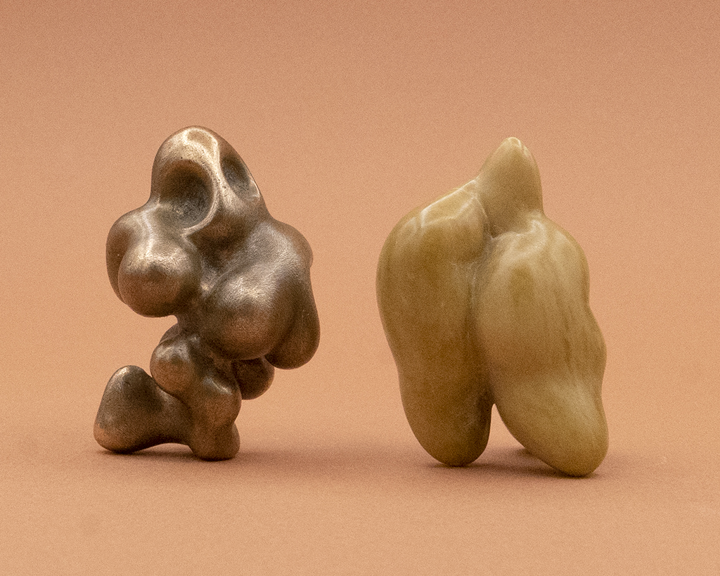 quasi-animal (2019) dark honed Italian agate alabaster and patinated bronze: L. 4.7 cm. – 1.8 in.mating sense (2019) Indian soapstone and patinated bronze: two forms L. 4.8 cm and L. 4.1 cm and 5.4 cmscultura che si bacia (2019) indian soapstone and patinated bronze H. 4.5 cm – 1.8 in.scultura che danza (2019) indian black soapstone and patinated bronze: H. 6.4 cm quasi-animal (2019) dark honed italian agate alabaster and patinated bronze: L. 4.7 cm Desire & Intimation (2019) bronze and Indian soapstone: H. 5.3 cm.sphynx (2019) indian black soapstone and patinated bronze: H.4.5 cm pendant/plug (2019) dark honed italian agate alabaster and patinated bronze: L. 6.8 cmabstract grasp (2019) italian alabaster and patinated bronze: L. 12 cmmating sense (2019) Indian soapstone and patinated bronze: two forms H. 6.4 cm and L. 6.3 cm embryo-like (2019) indian soapstone and patinated bronze: L. 8.5 cmscultura che si separa (2019) Indian pink soapstone (two forms L. 8.8 cm and L. 4.1 cm) and patinated bronze: L. 9.4 cmmating sense (2019) indian black soapstone (two forms: L. 5.8 and L. 4.5 cm) and patinated bronze: L. 6.9 cmquasi-animal (2019) dark honed italian agate alabaster and patinated bronze: H. 4.5 cm scultura che si bacia (2019) indian soapstone and patinated bronze H. 4.5 cm sphynx (2019) indian black soapstone and patinated bronze: H.4.5 cm