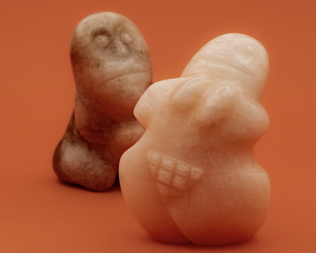 human turtle (2023) silver cloud alabaster and pencils: H 15 cm – 5.9 in.Persona (2023) terracotta: H. 11.5 cm. – 4.5 in.plaster #1 (2023) plaster: H. 9.2 cm. – 3.6 in.diversity, scale, context (2023) Princess Carlotta green alabaster: H. 6.2 cm – 2.4 in. hope (2023) terracotta: H. 21 cm. – 8.3 in.missing (2023) terracotta: H. 15 cm. – 5.9 in.voce-scultura (2023) terracotta: H. 13.2 cm. – 5.2 in.the body is never finished , 2023, bruno caramella alabaster and peach alabaster: H 7.9 cm and 7.4 cm